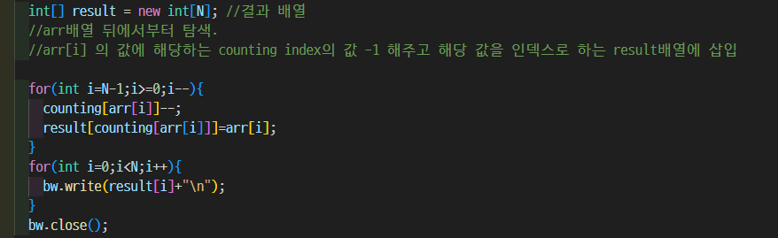 arr의 값을 인덱스로 하는 counting의 값을 -1 해주고 그 값을 인덱스로 하는 result에 arr의 값을 삽입한다.