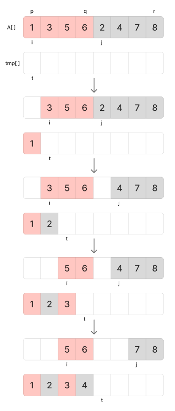else tmp[t++] <- A[j++] //의미 : tmp[t] <- A[j]; t++; j++;