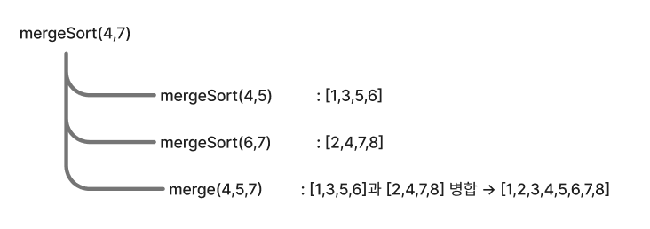 아래는 오른쪽 절반 mergeSort(4,7) 처리 과정이다.