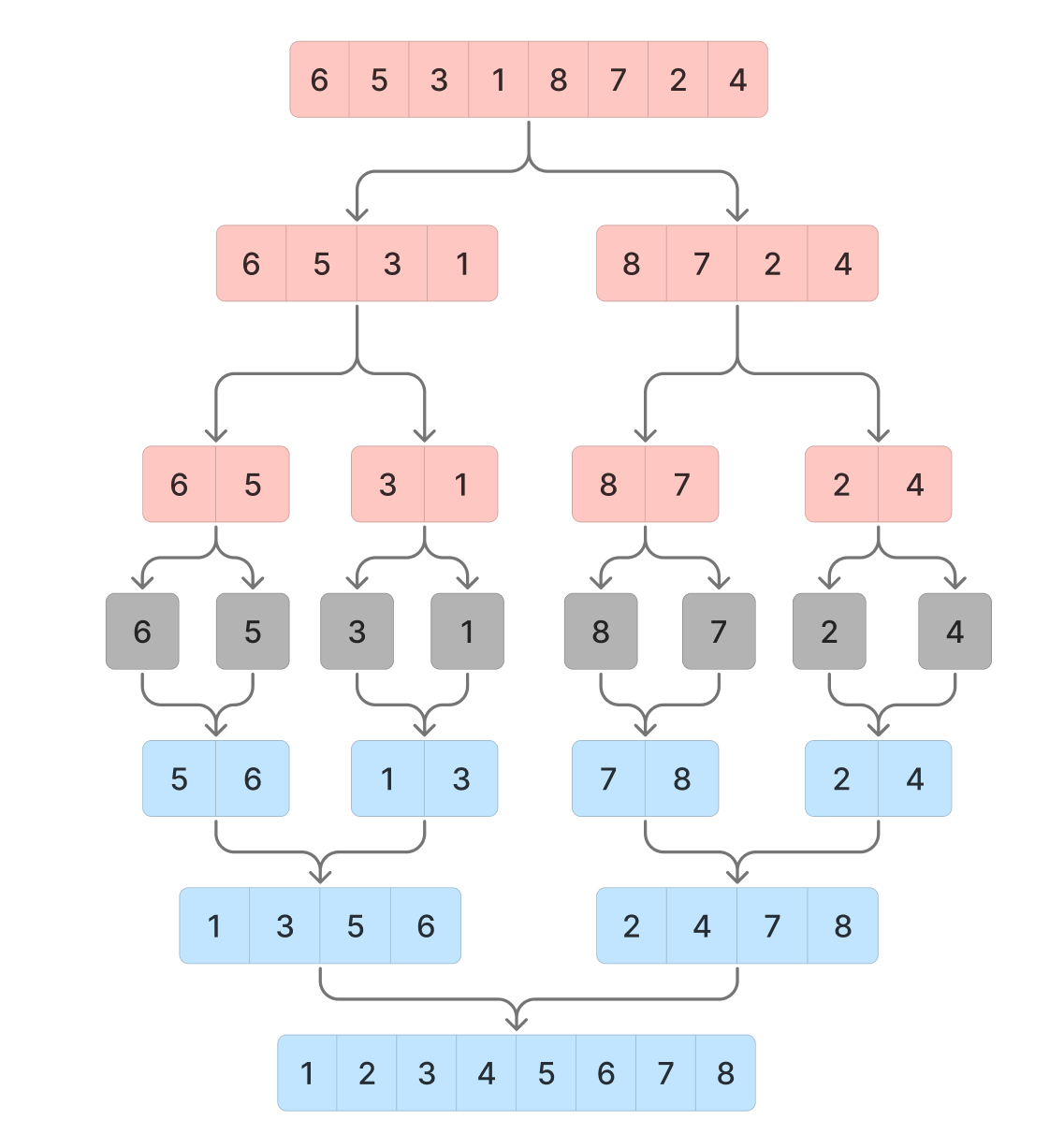 [6, 5, 3, 1, 8, 7, 2, 4]인 배열을 병합 정렬 해보자
