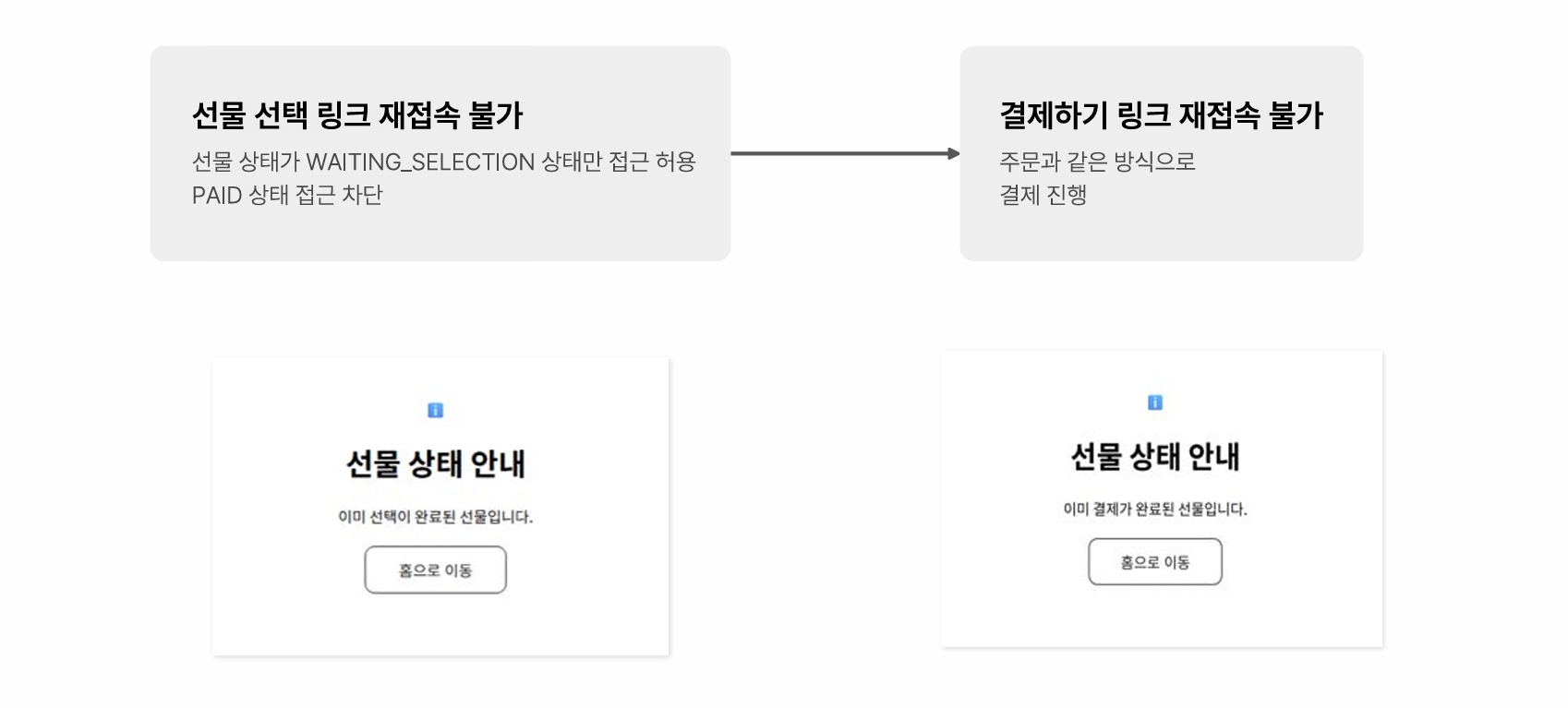 또한 보안을 위해 링크 접근을 제한했으며, 만료, 선택 완료, 결제 완료 시 재접속하지 못하도록 처리했다.