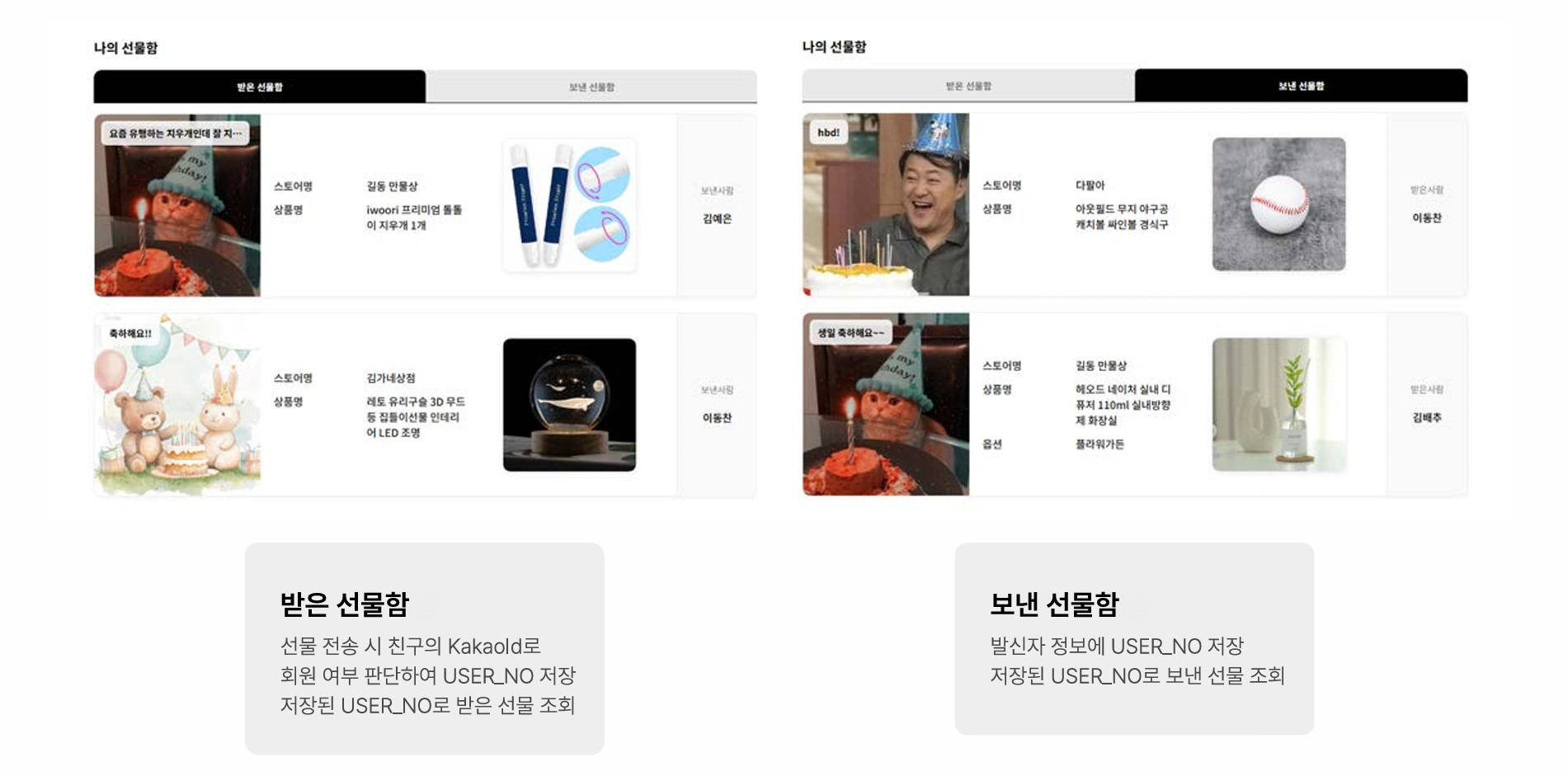 결국 카카오 친구 피커에서 제공되는 카카오 ID를 활용하여 수신자 정보를 저장하고 받은 선물함 기능을 구현할 수 있었다.