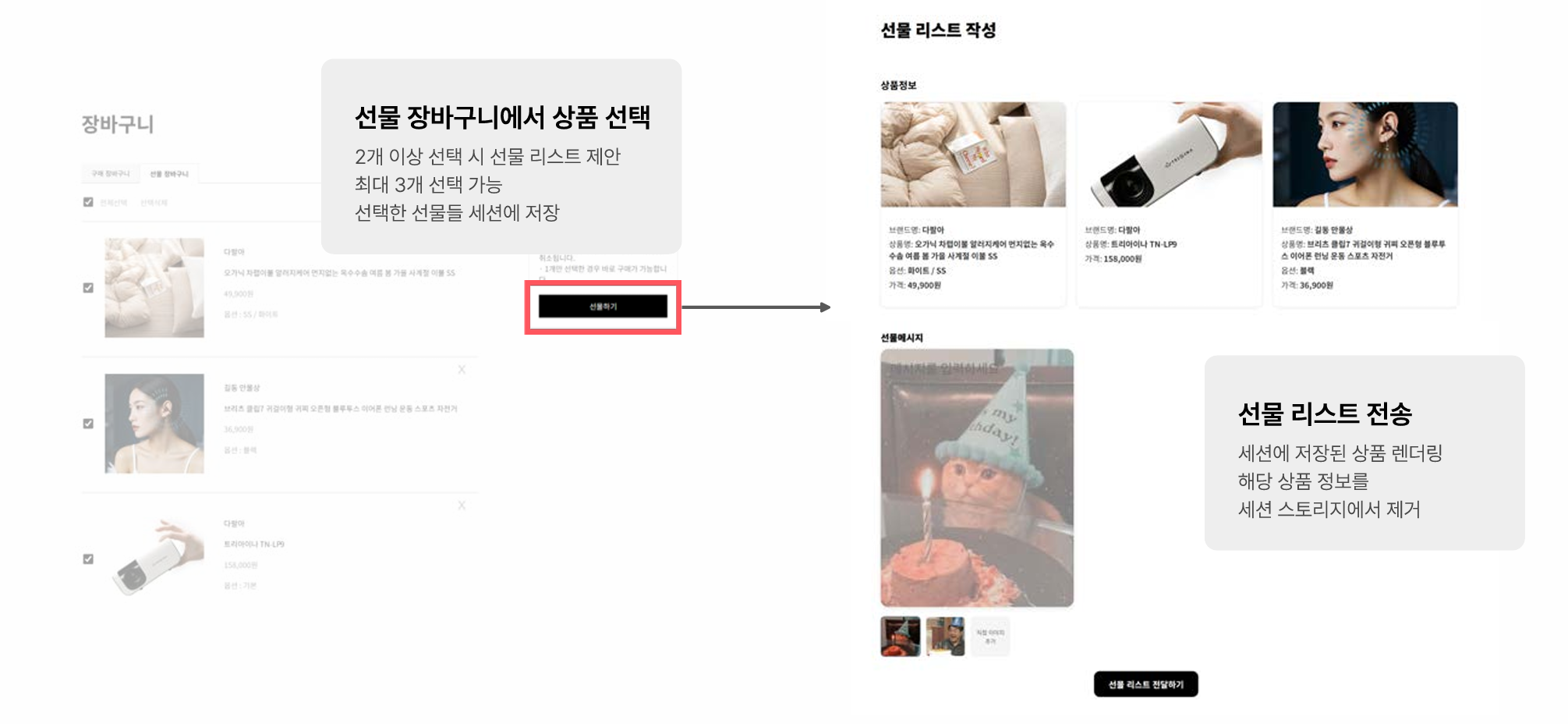 선물 리스트는 사용자가 2~3개의 선물을 담아 친구에게 전송하고, 친구가 선택하면 결제 후 전송하는 기능이다.